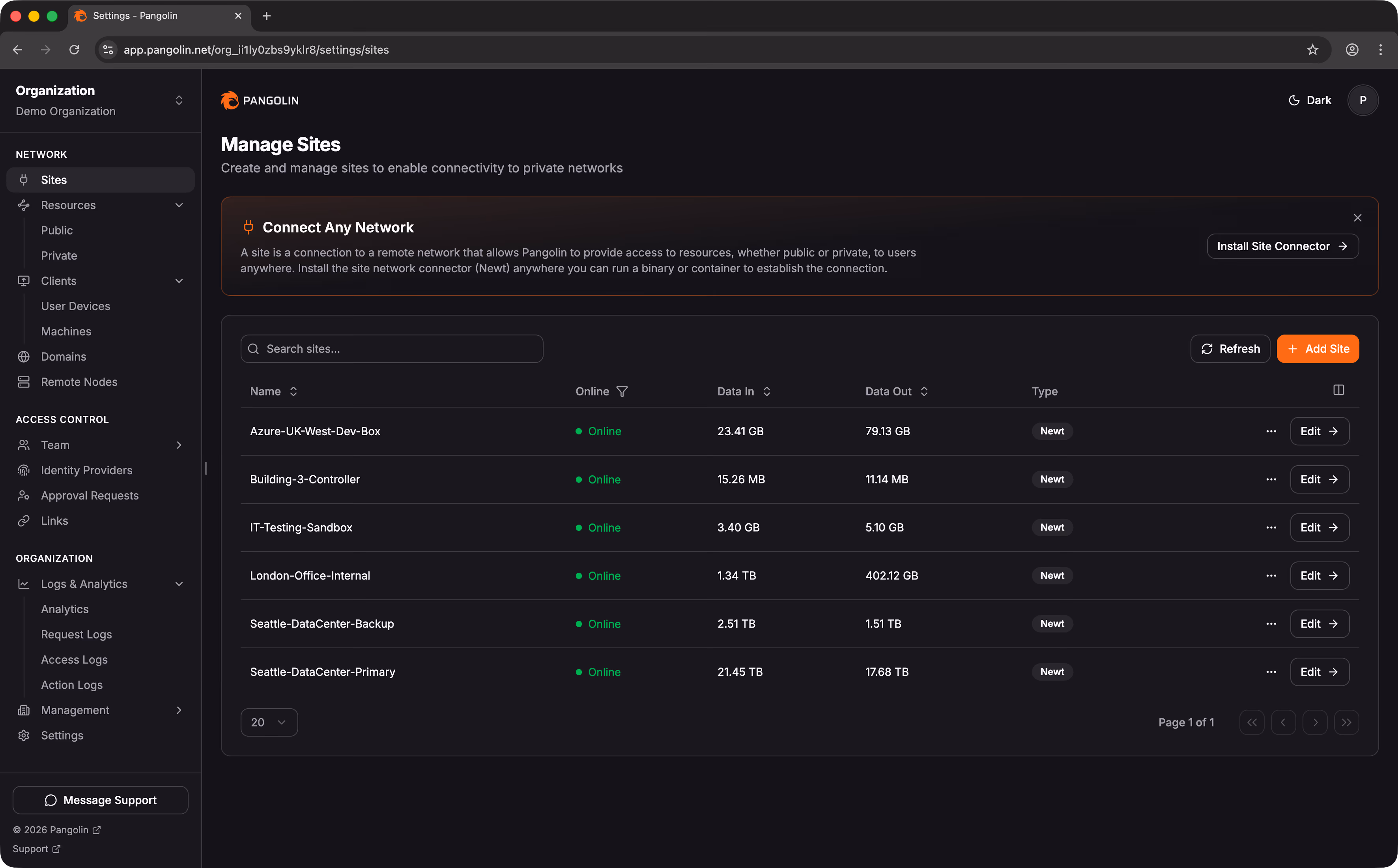 Sites extend Pangolin’s secure access to your networks - office LANs, cloud VPCs, data centers, and edge locations. A site is a logical representation of a network segment connected via the Newt connector: a lightweight software component you install on a host that already has network access. Newt creates secure, outbound-only tunnels to the Pangolin control plane. No public IP addresses or inbound firewall rules are required; infrastructure remains behind the perimeter.