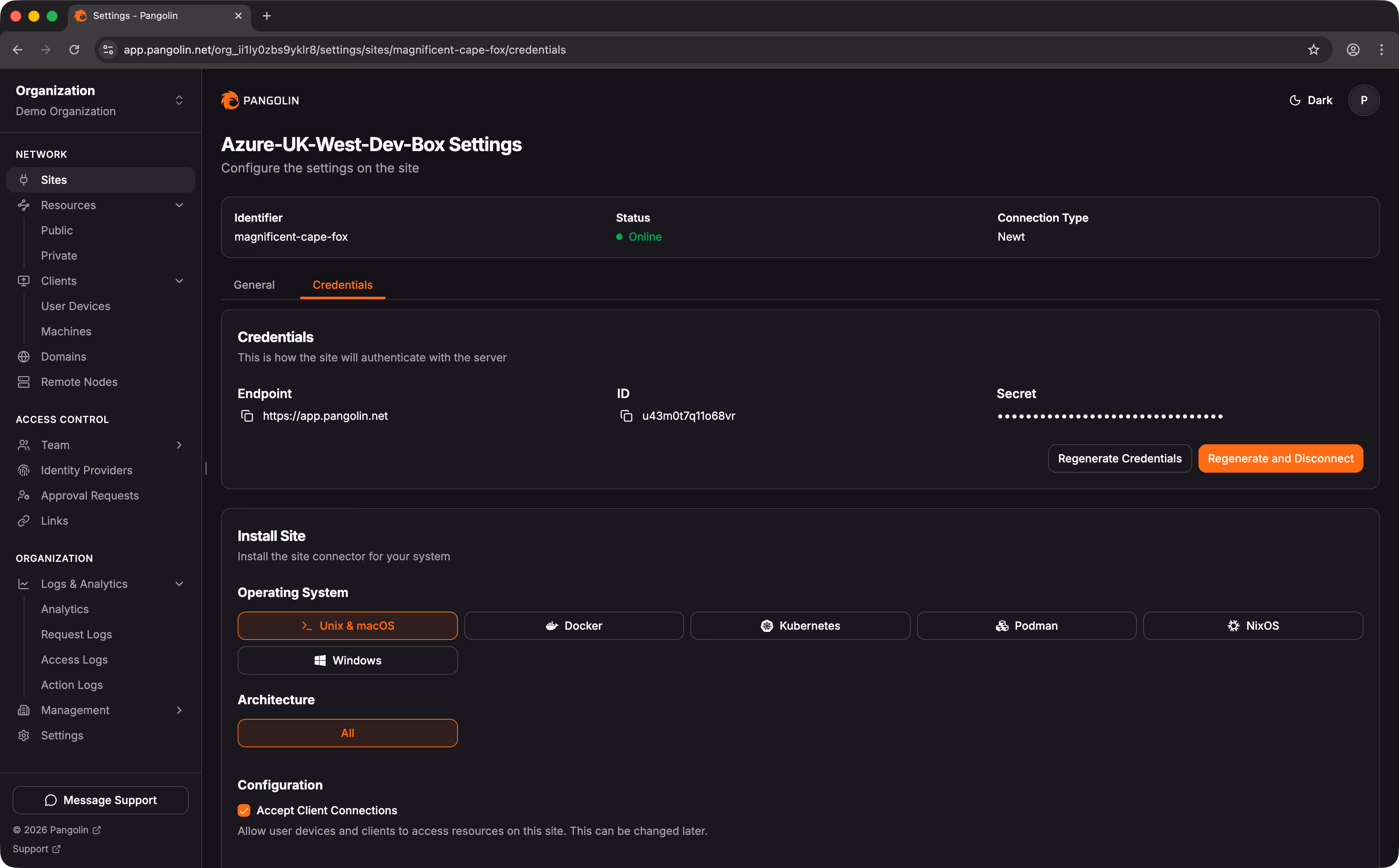 Each site is provisioned with credentials (endpoint, ID, secret) and supported deployment options: Unix, Windows, Docker, Kubernetes, and others. Credentials can be rotated without re-deploying the connector.