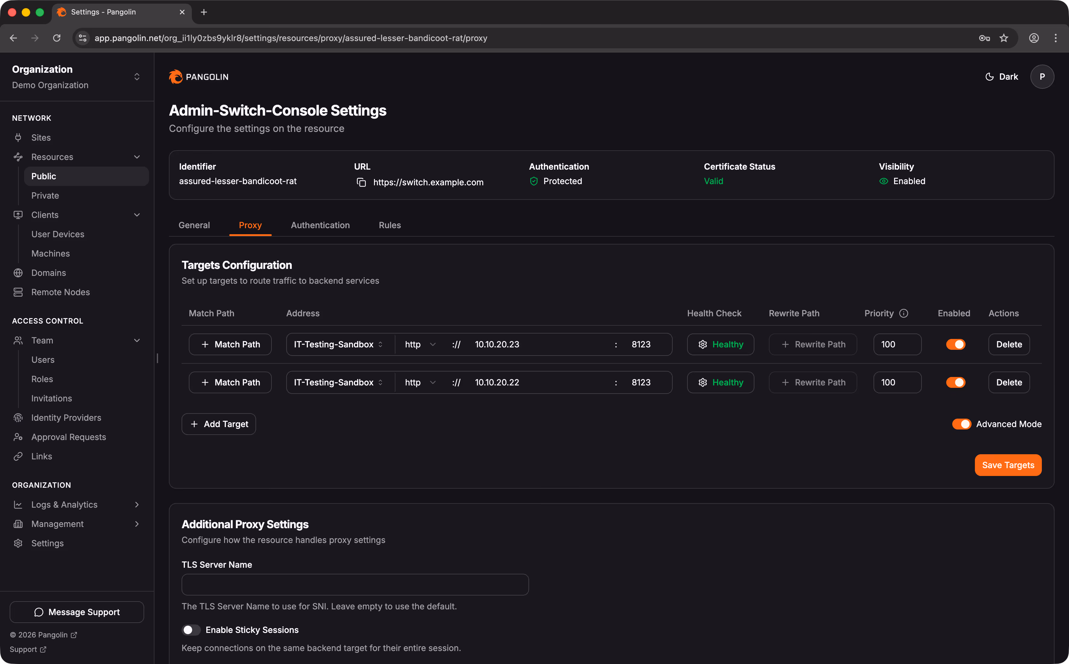 You configure backend targets (addresses and ports), path-based routing, optional path rewriting, and health checks. Traffic is sent only to healthy targets. Applications remain behind the firewall; only the site’s outbound tunnel is used.
