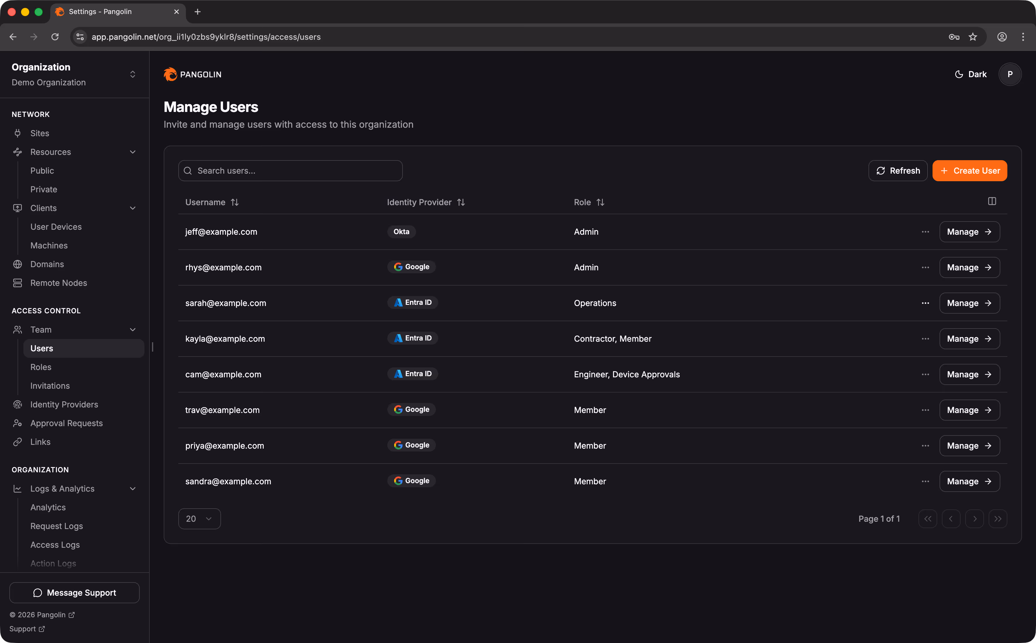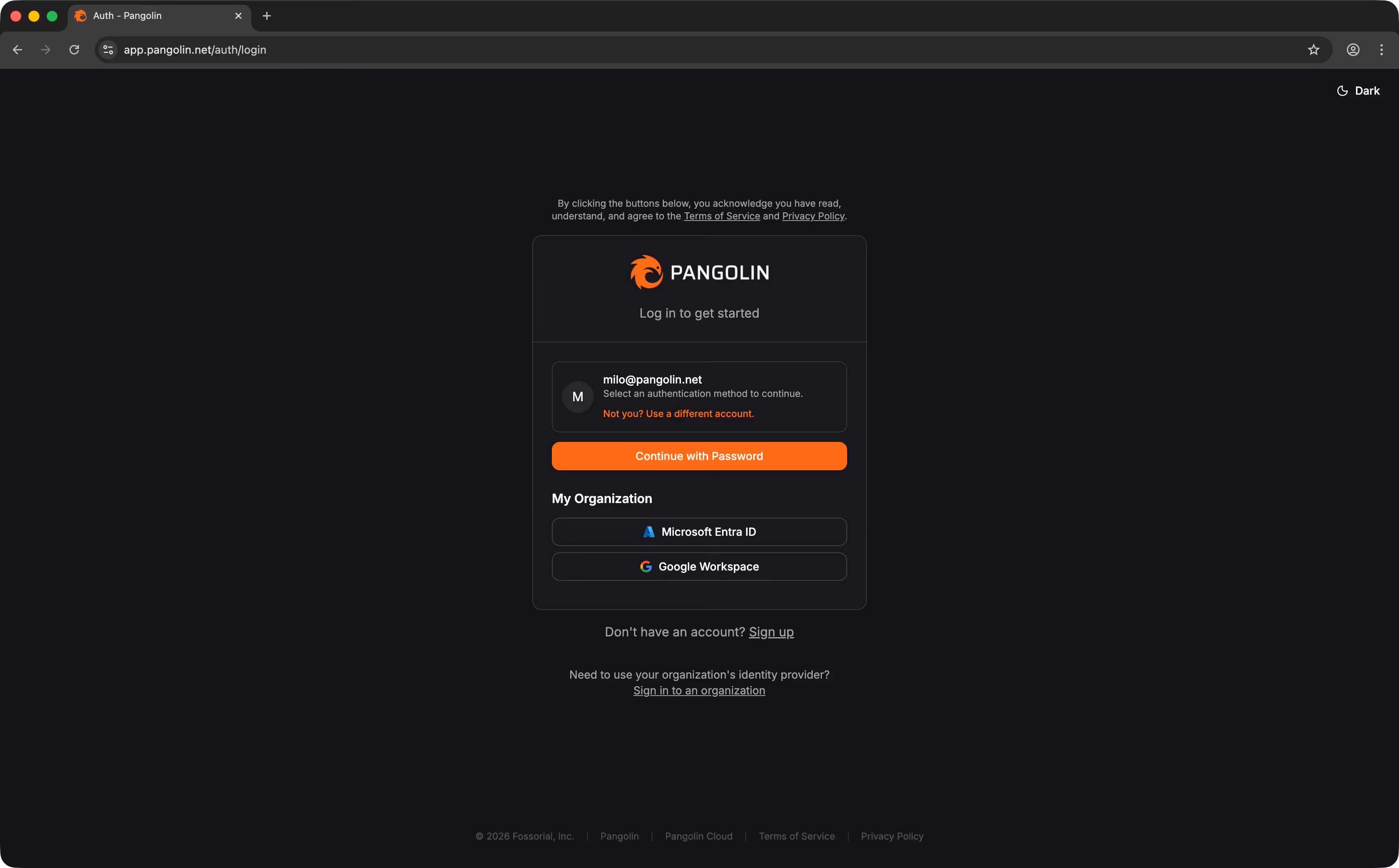 Users authenticate via the Pangolin login page or the client. Organizations can use a single identity provider - Microsoft Entra ID, Google Workspace, Okta, or another OIDC/SAML-compatible IdP - for SSO and MFA. It consumes identity from the IdP and applies the roles and resource entitlements you configure. Pangolin can also manage its own set of internal users if you are not working with an IdP.