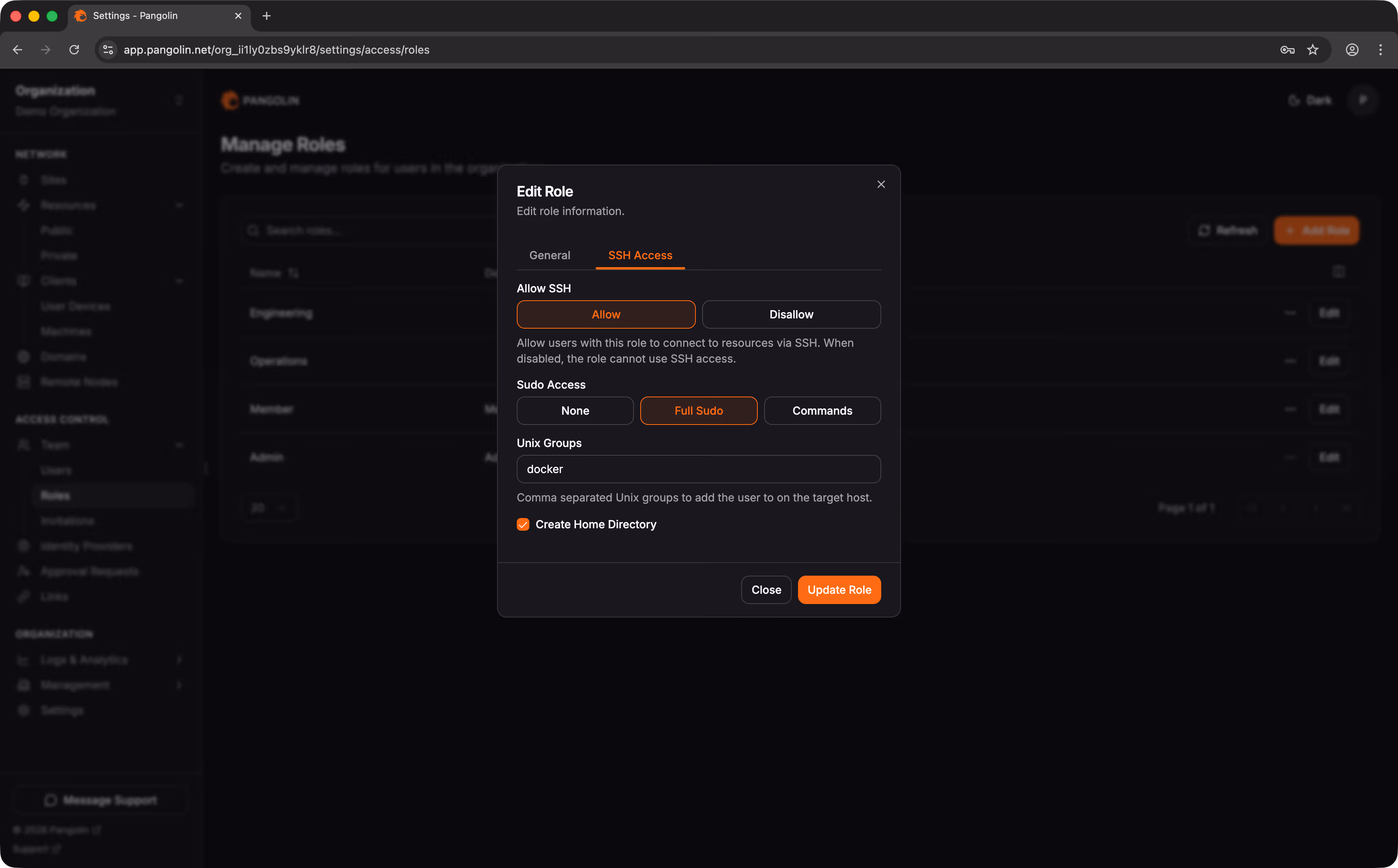 Roles can include SSH-specific policy: whether SSH is allowed, sudo level (none, full, or restricted commands), Unix groups, and home directory provisioning for use with Pangolin's ssh daemon which can run on the site or as a remote auth daemon on the same network the site can access. This gives a single place to define infrastructure access behavior for each role.
