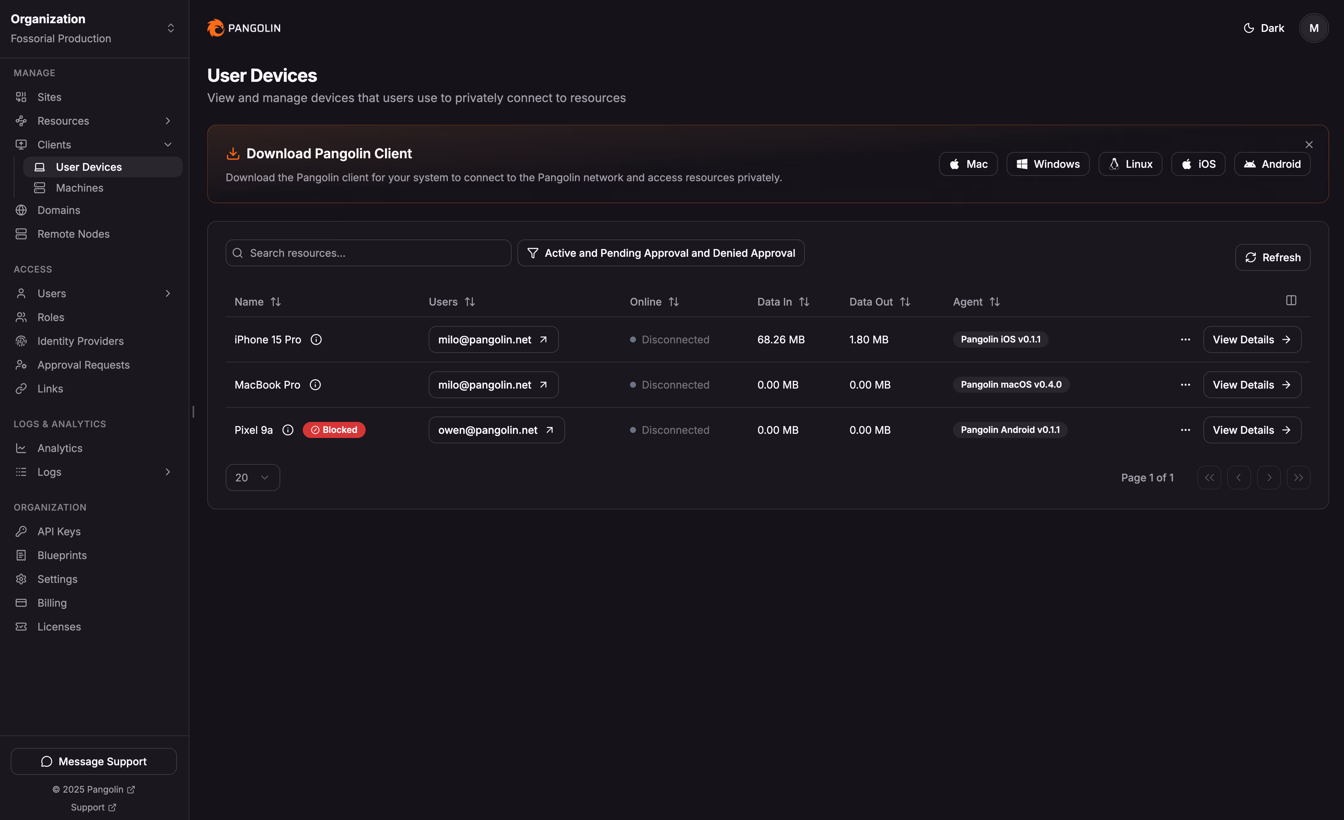 For private resource access, users (or automated systems) use the Pangolin client on supported endpoints (Mac, Windows, Linux, iOS, Android). The client authenticates, receives the set of authorized resources, and establishes encrypted tunnels directly to the appropriate sites. No per-application configuration is required; the client handles routing and tunnel management.