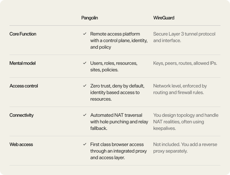The comparison between Pangolin and WireGuard often misses a key distinction. While WireGuard is a superb, high-performance Layer 3 tunnel protocol, it functions purely as a secure network interface, not a complete remote access solution. Pangolin, however, is a full remote access platform that uses WireGuard as its foundation. It builds upon WireGuard by integrating essential features for real-world secure deployment, including identity management, policy enforcement, automation, and a user experience that doesn't demand specialized networking knowledge.
